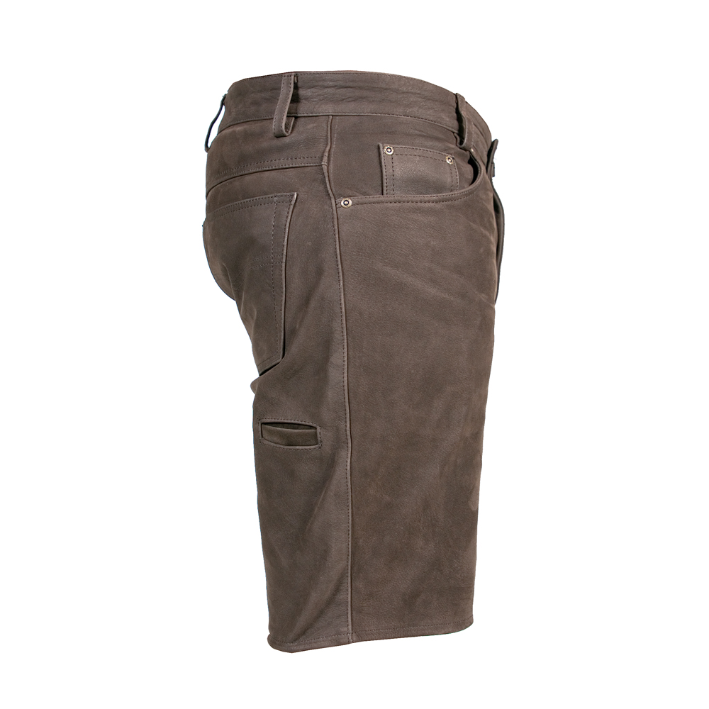 Diese klassische Ledershorts mit Reißverschluss und Baumwoll-Innenfutter ist aus robustem Leder gefertigt und ideal für die Jagd oder andere Aktivitäten geeignet. Am rechten Hosenbein befindet sich eine nützliche Messertasche, die Hosentaschen sind jeweils mit Nubukleder ausgestattet.